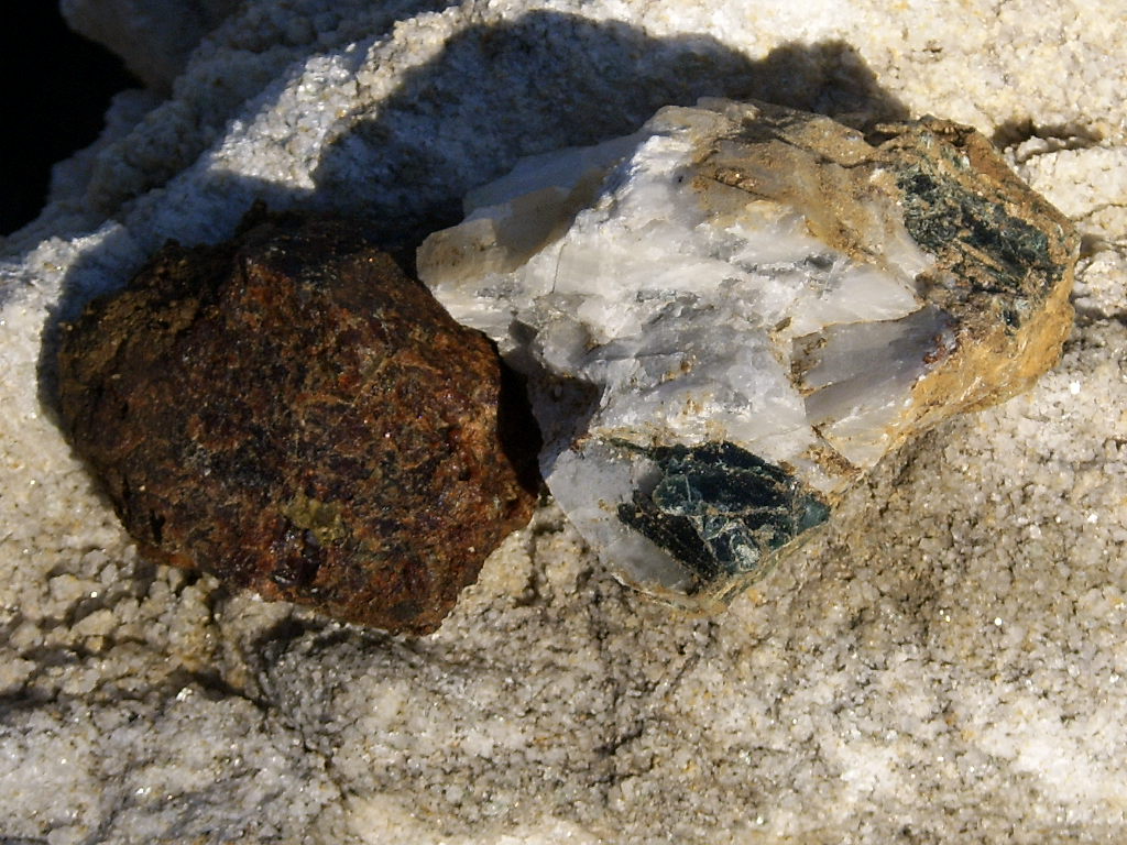 Фото Кориневского В. Г., сентябрь 2006 г. Ахматовская копь, кварц в обрамлении граната